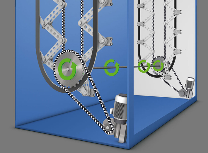 Equipado com dois motores sincronizados, o Hänel Rotomat garante uma movimentação eficiente e silenciosa, mesmo em operações com carga assimétrica. Esta arquitetura mecânica de precisão assegura: